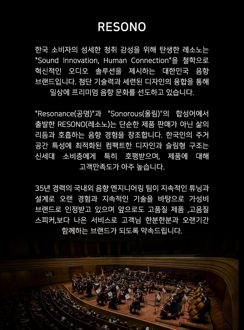 - 브랜드: JBL, 소니, 보스(Bose), 하만카돈, 클립쉬, 야마하, 브리츠 등 용도에 따라 선택지 다양 하지만 레소노 제품은 대한민국 음향 브랜드 로써 혁신적인 오디오 솔루션을 제시하는 일상의 프리미엄 으로 일상 음향의 문화를 선도하고 있습니다.